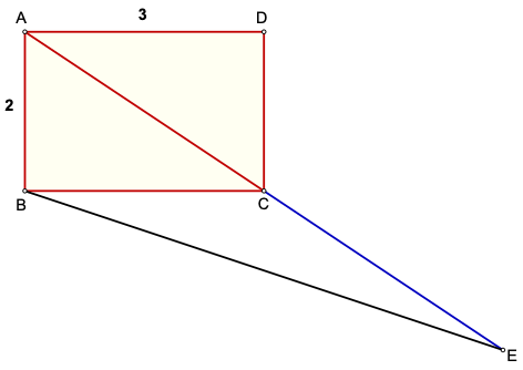Quadrilateral ABCD is a rectangle. The length of diagonal AC is congruent to the length of segment CE. Find the length of segment BE. (AB is 2 and AD is 3)